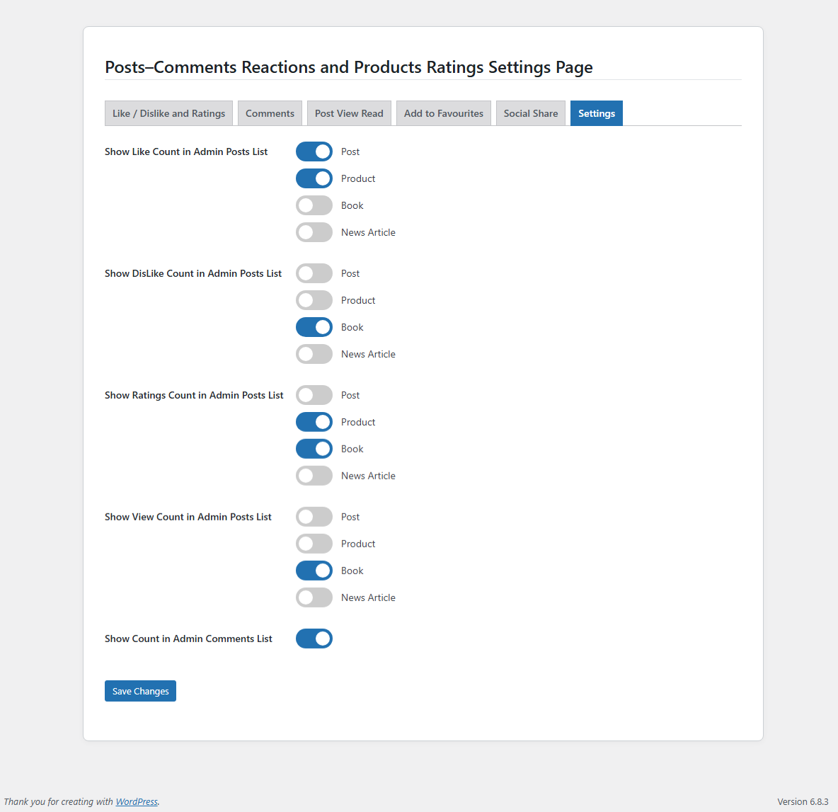 - Admin columns (Likes, Dislikes, Ratings, Reads) now display only for selected post types.